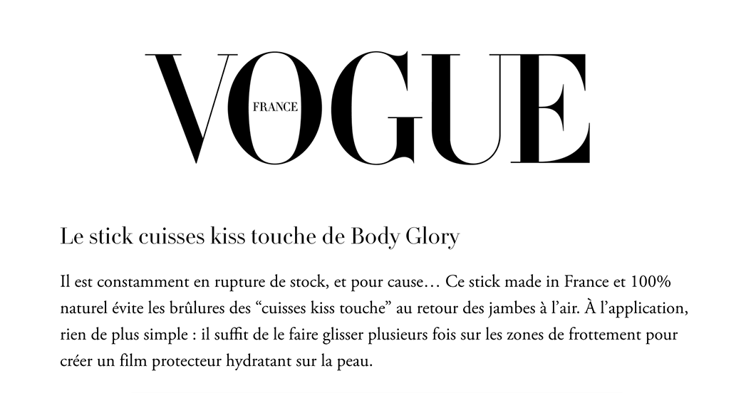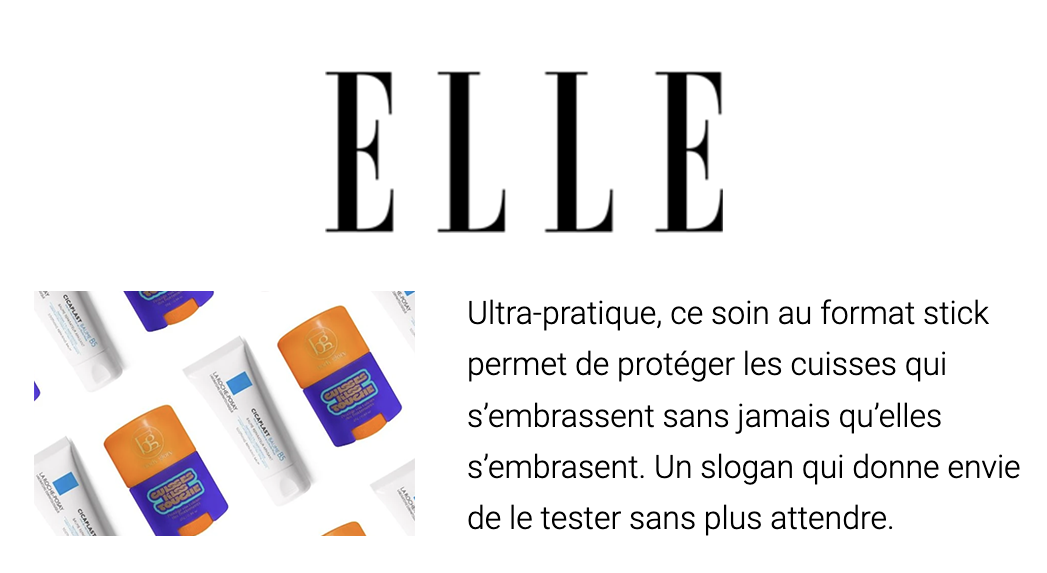 "C'est le produit magique pour atténuer le frottement de vos cuisses. Qui dit été,dit chaleur et donc jambes à l'air libre. Mais cela signifie aussi que vos cuisses se font un malin plaisir à se tenir compagnie l'une et l'autreau risque de provoquer une irritation."